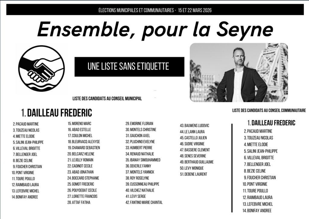 Notre liste, Ensemble pour La Seyne, est une liste citoyenne, indépendante, sans étiquette.